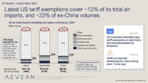 In this very dynamic situation, the latest round of (temporary) tariff exemptions on consumer tech and semiconductors mainly affect US air imports from Asia Pacific (24% in tonnes, 67% in value), and China-US (22% in tonnes, 67% in value).