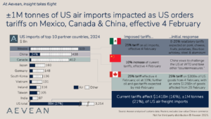 ±1M tonnes of U.S. air imports affected as the U.S. imposes tariffs on Mexico, Canada, and China, effective February 4